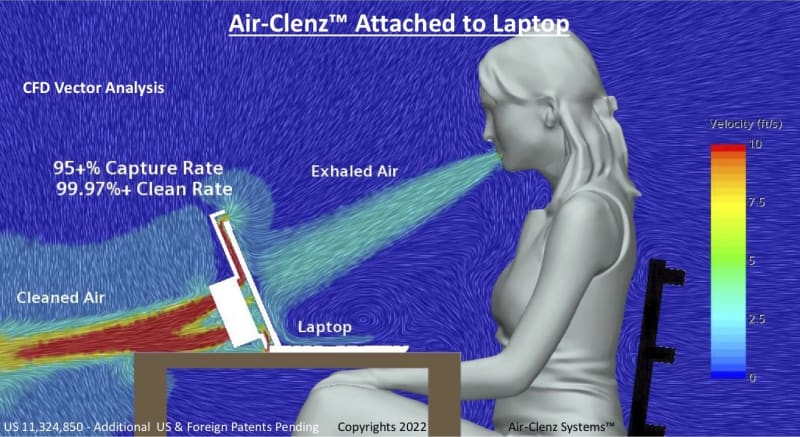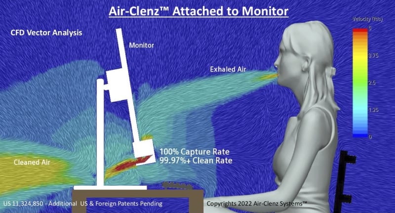 Air-Clenz™ (http://www.Air-Clenz.com) is the first and only exhaled air capture and purification system in the world. Air-Clenz™ can quickly capture and clean exhaled air within 1 inch to 3 feet of one’s face. It has been patented, developed, prototyped and proven. Air-Clenz™ can be integrated or attached to desktop computer monitors or laptops. In five seconds or less, it captures exhaled air close to the user’s face, before the exhaled air disperses in the room environment and possibly infects others. Captured exhaled air, as well as surrounding room air, is then cleaned by the air purification chamber to a 99.97% level, free of COVID and other airborne pathogens. Clean air is then released back into the room. This is all accomplished for each exhaled air breath within five to ten seconds. Independent third-party Computational Fluid Dynamics (CFD) modeling proves that nearly 100% of user-exhaled aerosols and droplets are captured and cleaned by Air-Clenz™-enabled computer monitors and laptops.
