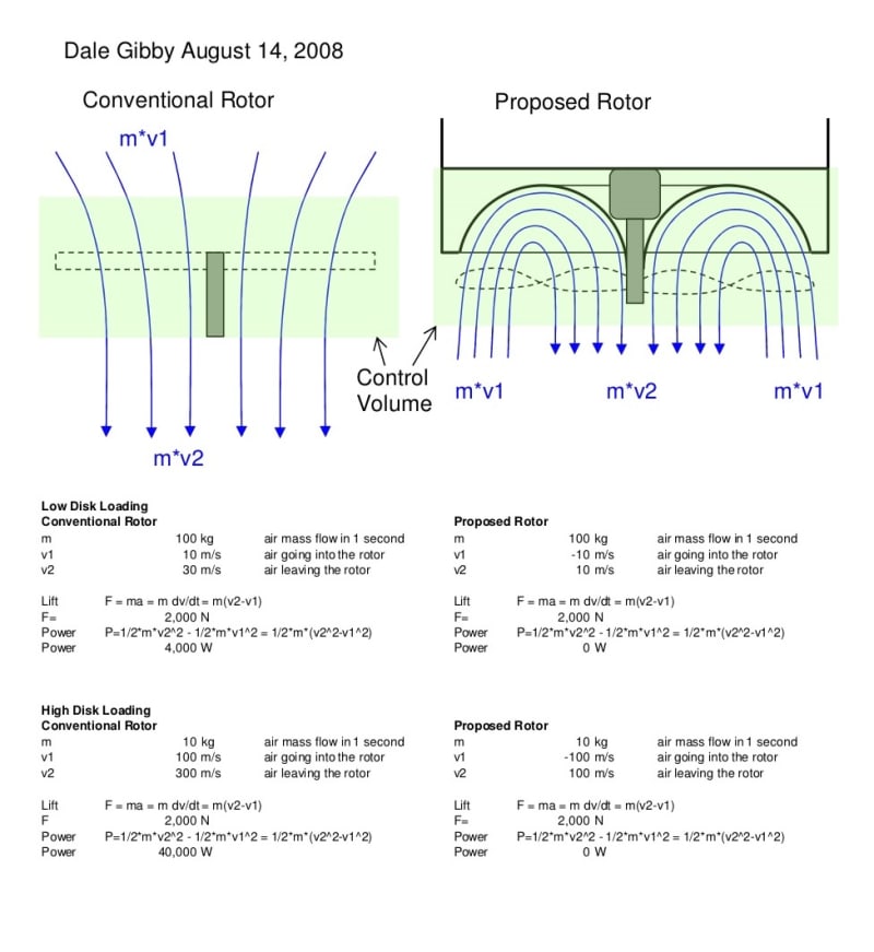 Therefore, lift is achieved by changing the direction of the air flow, not the speed of the air flow. Work is a function of speed. (E=1/2 m*v^2) Since the air does not change speed, no work is required to accelerate it. If an inviscid fluid is assumed, the power needed to provide lift is zero. (See control volume calculations.) In practice, a small amount of power will be required due to air viscosity, and imperfections in design. However, this is very small compared to the work of air acceleration in conventional rotors.