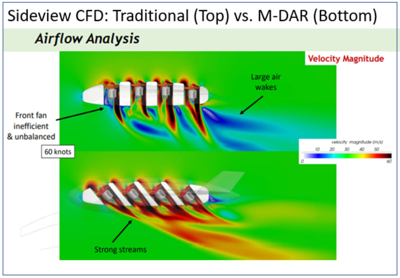 State of the art tilt-rotor aircraft such as the V-22 must rotate large heavy mechanical engines and their blades 90 degrees when transitioning. For tiltrotors this is an intensive and complex mechanical and aerodynamic process enacted within a very narrow flight envelope. Tilt-rotors also suffer from downwash onto their wings. In comparison, M-DAR aircraft can take-off, transition, and land by differential thrust of the fans. In other words, a drone or aircraft that uses the M-DAR propulsion system can accomplish this task as fast as the flight control computer provides the command. In addition, there are no heavy or complex actuators or control surfaces needed in an M-DAR aircraft. This makes M-DAR aircraft lighter, more survivable, and easier to learn than either helicopter or tilt-rotor designs.