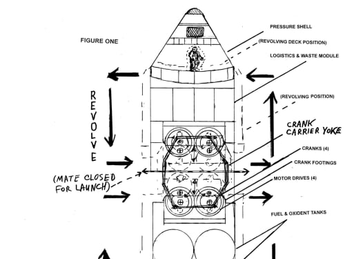 A Mars spacecraft orbiter comprises a crew Habitat Block and a Service Propulsion Block, which are connected via a special crankset mechanism (Figure One) or else equivalent revolving means. The two halves revolve contrary to each other and act as counter-masses.