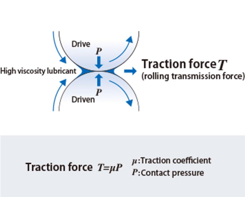 The NerraTrac continuously variable transmission (CVT) utilizes a traction drive in a traction fluid (high viscosity lubricant) that ‘solidifies’ momentarily between two hardened metal surfaces under high contact pressure, thus providing a traction force. It employs the same elasto-hydrodynamic lubrication principle used by all current automotive CVT transmissions.