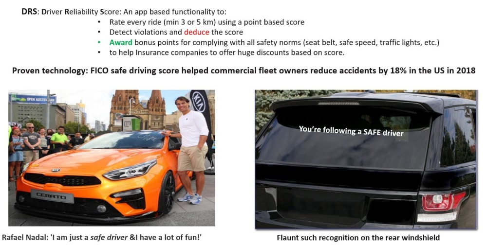 - I believe the "emotional connect" any driver has with his family members or friends will be of immense help when "activated" through infotainment system message upon detection of harsh driving and can have a soothing effect on the mind of the driver at that instant enabling him/her to recourse to a safe driving pattern.