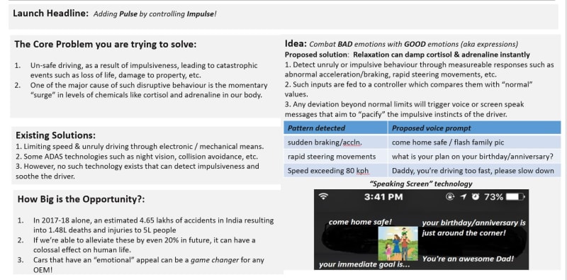 The crux of my idea is centered around “human safety” using techniques such as data analytics, image processing, etc. under the gamut of Machine Learning (ML) and Artificial Intelligence (AI). Real time data processing will happen on an on-board TCU (telematics control unit), which upon detection of rash driving signals, will fetch corresponding audio and/or video messages from a cloud to play back real time through the Infotainment system in the vehicle.