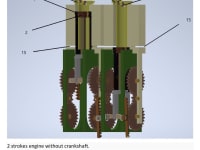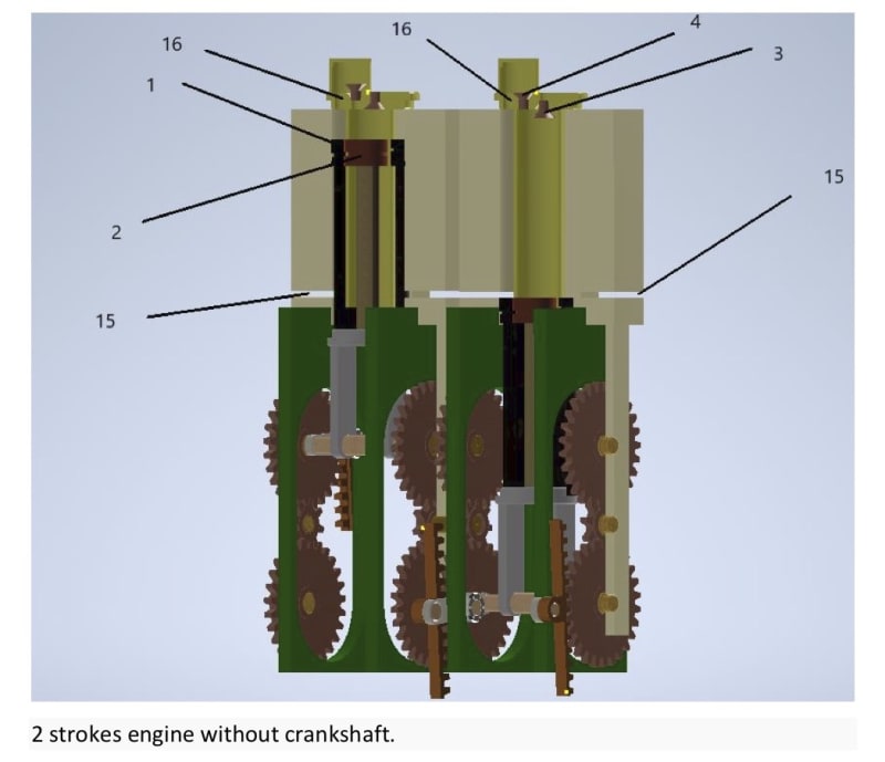 The idea of the new engine concept is to replace the crankshaft by gear racks that move linearly and drive the gear wheels (sprockets) creating torque.