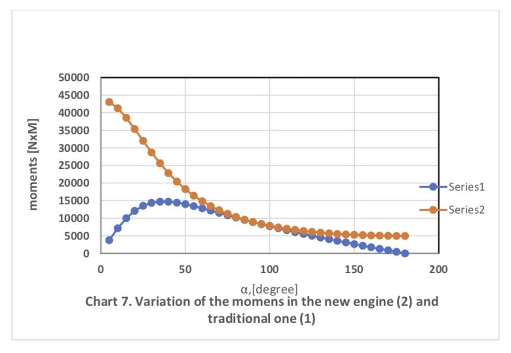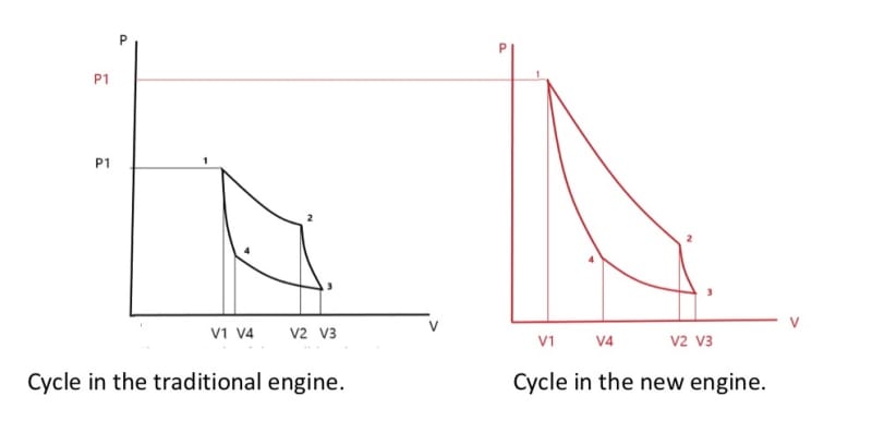 2. The time delay at the TDC, the pressure and temperature are higher than in the traditional one by at least 20-30%. The HP of the new engine will be more than in the traditional one in the same scale using equal amounts of fuel for both engines.