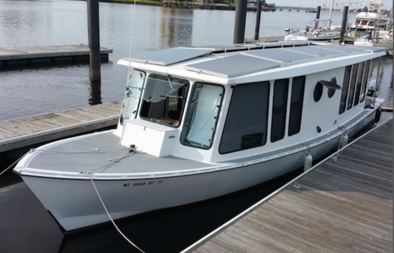 The uniqueness of the solar boat is in its roof to draft relationship which allows the functionality of an extreme shallows boat that can access intracoastal food growth and marine farming in closed lake areas as well as in salt water bays, estuaries and tidal rivers. Unique also, is the trimming down of electric power use, better energy storage per dollar and zero cost of fossil fuels.