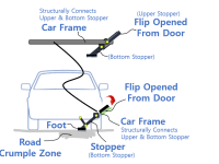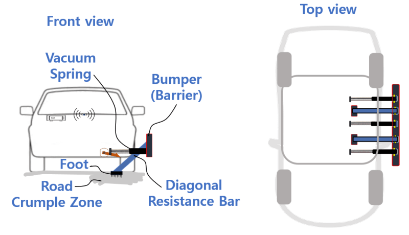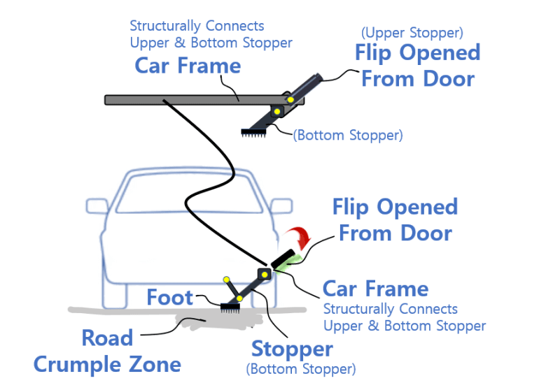 However, in reality, it is impossible to create physical extra space out of the blue sky, so this invention adopts the ground(the road the car drives on) into the crumple zone.