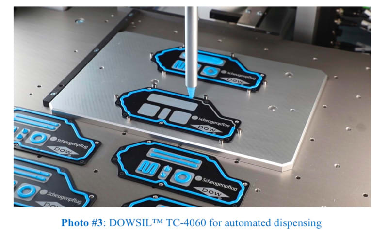 While EV battery technology receives much attention due to the size and well-chronicled quest to lower cost and boost energy density, Inverter technology follows the same complexity and innovation trajectory. The critical, power-handling semiconductor components in Inverters, such as IGBT and MOSFET, manage voltage and provide temporary energy storage. Smaller, denser Inverters are required to make next generation EVs with improved drive efficiency and lower cost. DOWSIL™ TC-4060 Thermally Conductive Gel delivers an unmatched combination of high dispensability for ultra-fast precision dispense, ultra-low softness to cover a range of different electrical components while providing stress-relief and long-term reliability to survive harsh power electronics environments. With a transformational change in performance properties, TC-4060 offers significant benefits for consistent, efficient heat removal with long-life and reliability valued by Transportation customers. These advances are critical to maintain safety and efficiency of “cannot-fail” power electronics drivetrain applications and the future of EV’s. Working with leading robotic dispense and automation company Scheugenpflug led to efficient customer adoption of TC-4060. Dispense under constant high pressure showed no filler sedimentation or fluid separation, unlike other competitive technologies. This ensured ease-of-use and less waste for long term, automated dispense, a difficult achievement for highly filled, high thermally conductive gels.