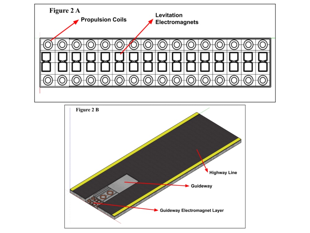 Maglev trains consist of two main parts: guideway and the train. There are several technologies like EDS and EMS to sustain levitation and propulsion. We changed the guideway design and used EMS. The up-to 10 person trains are designed as shown in figure-1. With these small trains we decreased the propulsion force and this decreased the size of the guidway and the cost. There are two parts of electromagnets in our guideway design. The first part (figure-2A) is for propulsion. These electromagnets are using AC and a driver is used to control frequency of the current so we can adjust the poles of electromagnets and control the speed of the train. The second part of electromagnets (figure-2A) are used for levitation. We decided to use quantum locking technology (figure-3B), that’s why these electromagnets are specially arranged. These electromagnets are using DC. The guideway is pretty small with 1000mm width and 200 mm thick. We can install these guideways to existing transportation networks (figure-2B). Highways in big cities with high traffic rates are our target area. We only need specially designed machines (figure-3A) which can dig a 200mm height hole and then place the guideway. Highway lines with guideways will be closed for other vehicles use and the system may be used for inner public transportation. Trains include type-2 superconducting magnets (YBCO) and closed-loop refrigeration system to maintain quantum locking.