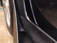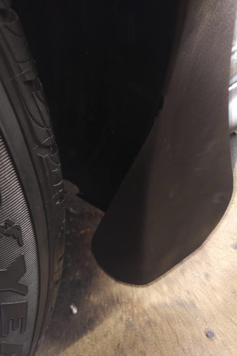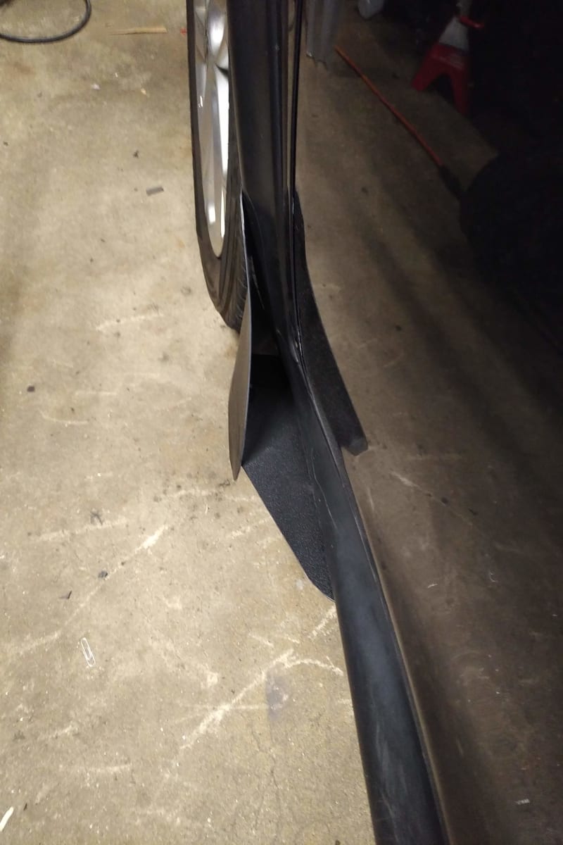 A new front mud flap design was developed to block the trajectory of denser material from hitting painted surfaces, while also smoothing airflow along the side of the vehicle, with a flap that extends into the wheel well combined with an expanding opening/diffuser to reduce pressure within the wheel well. Material was intentionally focused on blocking the trajectory from the tire and not adding frontal area, with rounded edges to reduce noise. A magnehelic gauge measured significant relative pressure drops within the wheel wells compared to both the factory mud flap and no mud flap, testing options on both sides of the vehicle. This pressure difference increased with speed. In addition, mud splatter on painted surfaces was virtually eliminated. Wool tufts showed a smoothing of airflow along the side of the vehicle. Subsequent versions reduced material and the potential damage from contact with deep snow (which tore off the initial prototype), while maintaining performance. A derived design is in testing to protect painted surfaces at the rear wheel while helping to smooth turbulent airflow off the rear tire and direct it toward the center of the vehicle to reduce drag.
