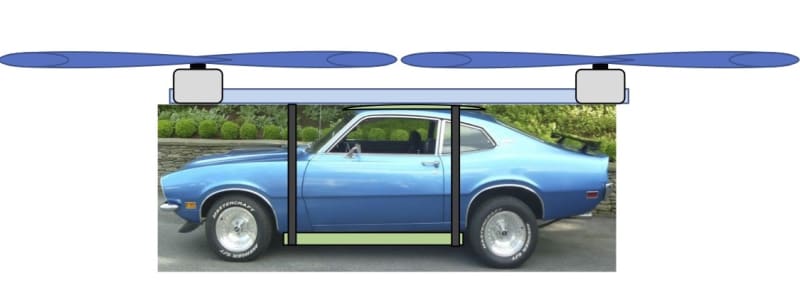The technology exists and has been safely and reliably demonstrated with drone aircraft. Electrically powered drones have proven sustainable, safe, and reliable flight capability. The Hawk Aerocar uses electrically-powered drone technology with multi-rotor lift motors in a flight module tailored for a personal automobile for the power and crew compartment. The car’s engine and fuel supply are used to minimize total vehicle weight which leverages the automobiles design, safety, and reliability.