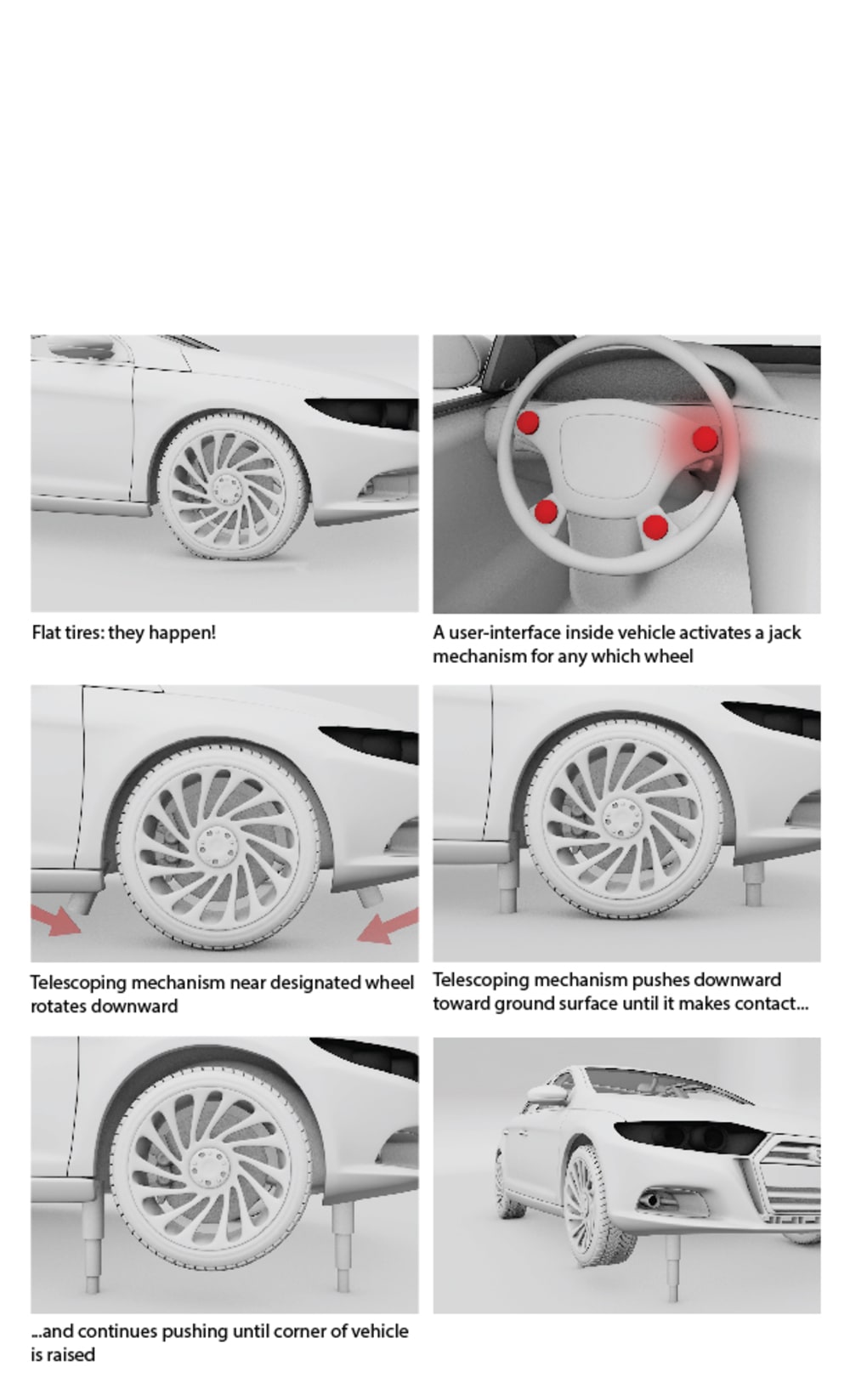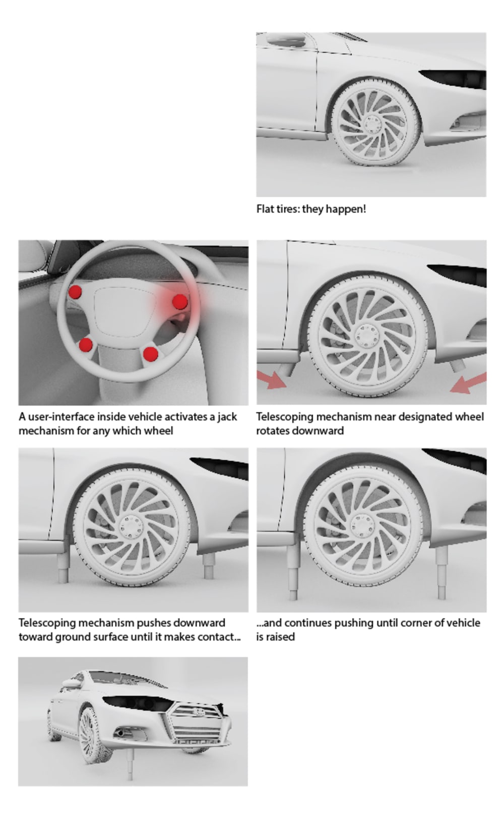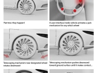 When flat tires happen a user interface inside the vehicle activates a jack for any of the four wheel selected. A telescoping mechanism near designated wheel rotates downward.