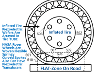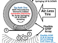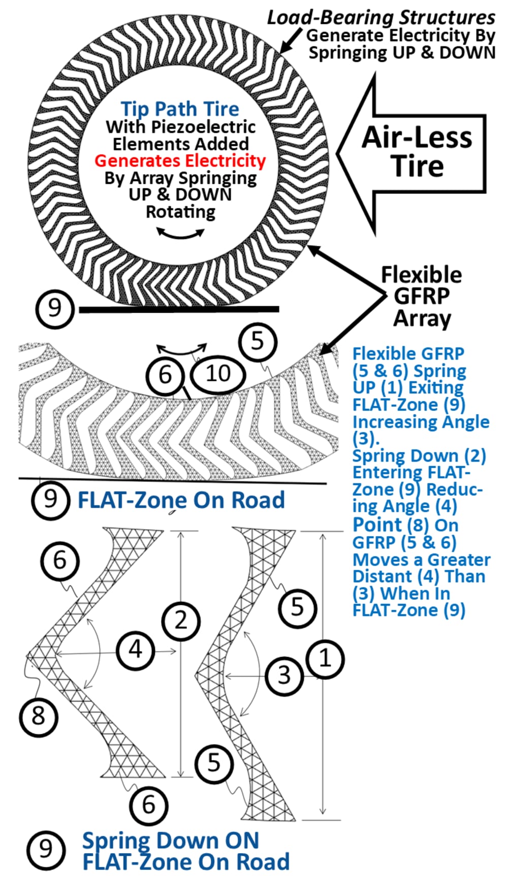 1st Picture: Load-Bearing Structures Generate Electricity By Springing UP & DOWN Tip Path Tires With Piezoelectric Elements Added Generates Electricity By Array Springing UP & DOWN While Rotating Flexible GFRP Array that enters the FLAT-Zone On Road Spring Down ON