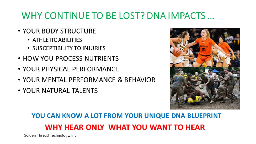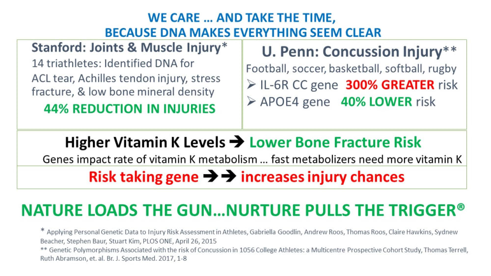 Knowing the relationship between a person’s DNA and their injury risk opens the opportunity to craft personalized strategies that lower injury risks, and lower injury severity should one occur. It is always a combination of nature, our DNA, and nurture, what we do with our lives. The age of onset for Huntington’s Disease is an example of how nurture can impact health and wellness. This is an autosomal dominant gene, where the one copy gives risk to the disease in the person’s 40’s. Research found that identical twins with this gene can have the age of onset differ by up to eight years. This is the role of nurture. Nature loads the gun, and nurture pulls the trigger.