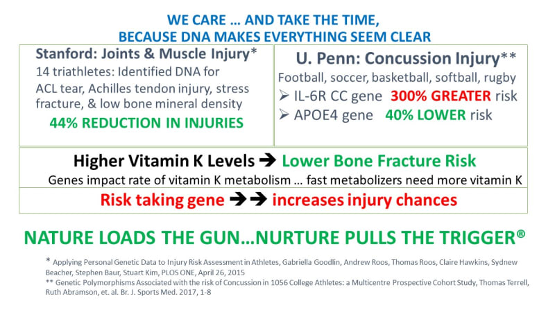 Our solution starts with each athlete’s DNA blueprint. Genetic variation explains differences in body structure, nutrition and metabolism, and behaviors. A key factor is that DNA is fixed: we go out of the world with pretty much the same DNA that we came in with. Genetic variation translates into differential risk for ACL tears, rotator cuff injuries, elbow and ankle injuries and injuries to the head and neck, One gene variant increases concussion risk by 300%.