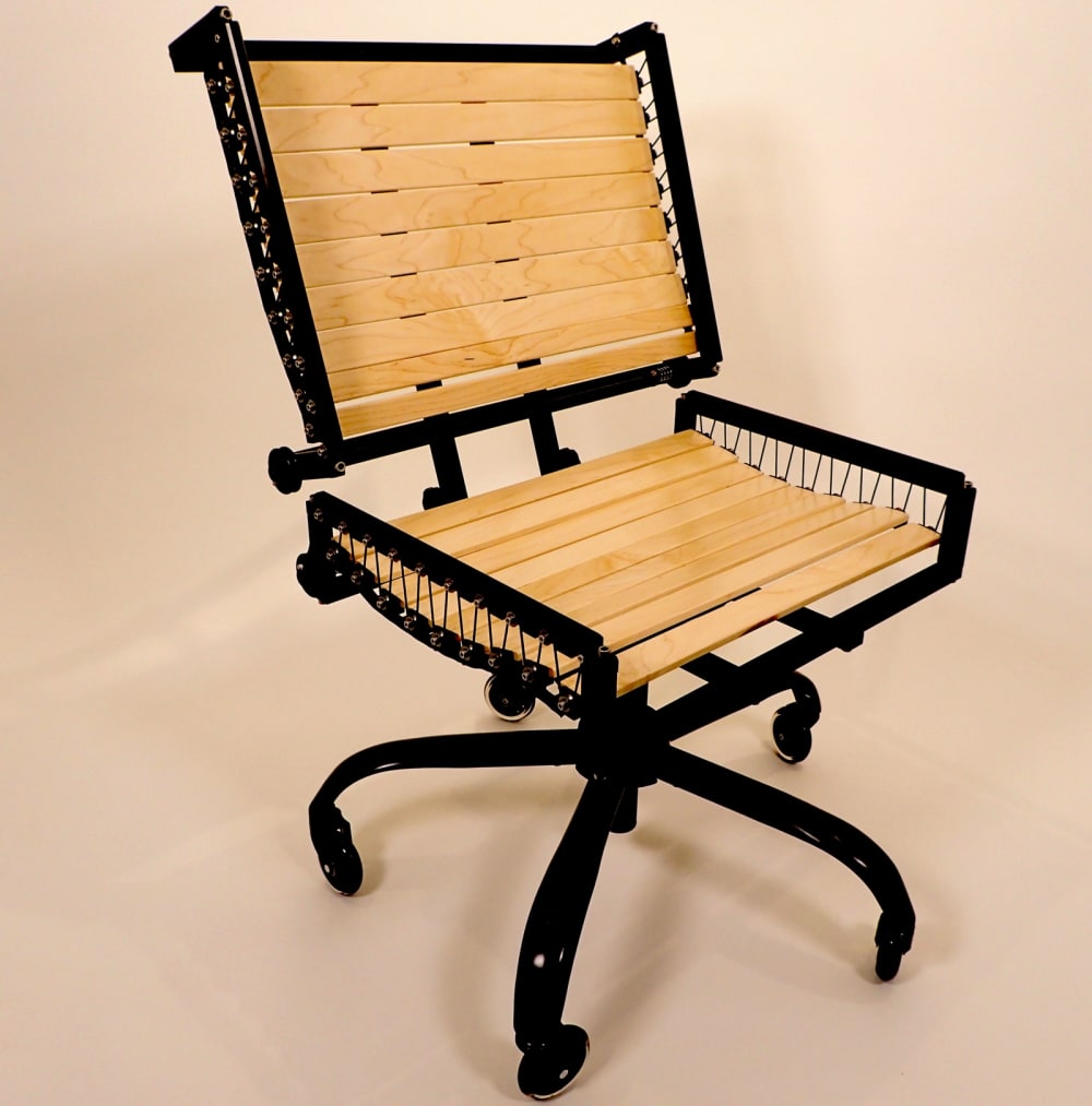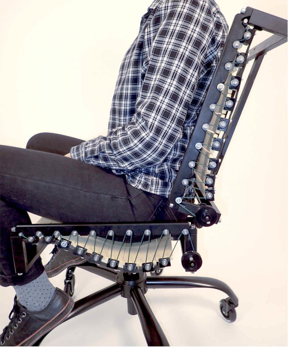A single cord is interlaced between pulleys on the chair frame and the supporting slats. When one slat moves, the others must compensate. Supporting force is only applied when the slats have found a balanced position and by the nature of the system, each slat must apply the same force.