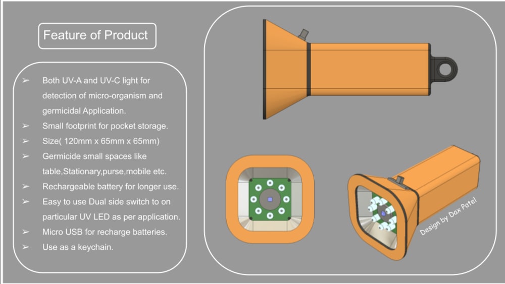 Also Includes the option to use just UV-C LED’s for germicidal applications.(UV-A is optional.) To disinfect the surface, we need 5 to 10 minutes of exposure time to the surface. We will use this torch to disinfect wallets, mobile phones, stationery, car keys, door handle, railings, keypads, mice, trackpads, etc. The size of the torch is very small, it fits in your pocket as well. You can use it as a keychain with your keys.