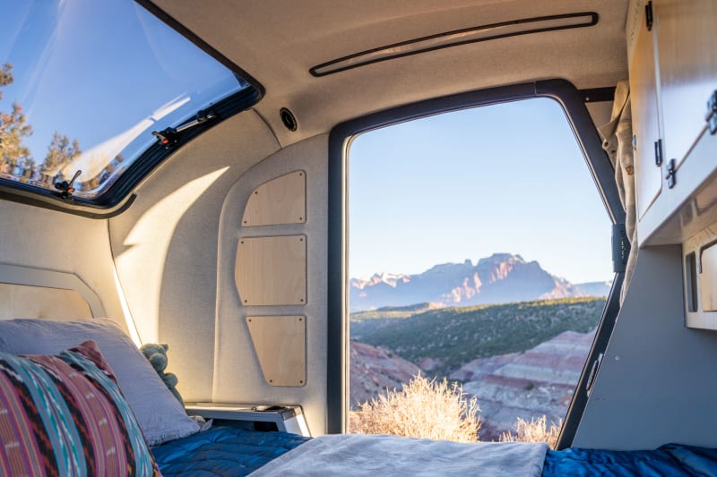 Inside the cabin, you’ll find a true queen-sized 6” memory foam mattress. Lay back and stare at the night sky through our 2.5’ x 5’ stargazer window or sit comfortably against the angled headboard while waiting out a storm with a spacious 42 ½ inches of headroom.