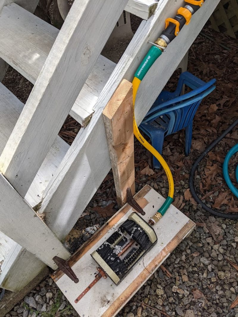 This device uses water and brushes to clean shoes. You place your shoe in the device and turn the water on and then move your shoe from front to back to clean the bottom and sides of the shoe. You can adjust the water to be more powerful and clean it faster and better. I use it all the time to clean dirt and mud off of my shoes so I don't track it into the house. It is very quick to do and very thorough. In the past I would have to take my shoes off and run them under the water in the sink to get them clean enough. Not anymore.