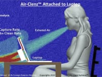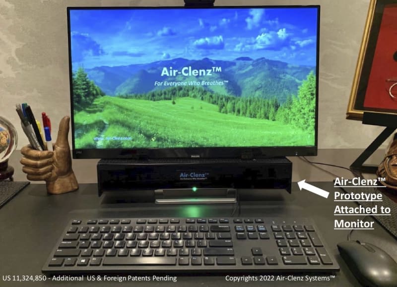 Air-Clenz™ (http://www.Air-Clenz.com) is the first and only exhaled air capture and purification system in the world. Air-Clenz™ can quickly capture and clean exhaled air within 1 inch to 3 feet of one’s face. It has been patented, developed, prototyped and proven. Air-Clenz™ can be integrated or attached to desktop computer monitors or laptops. In five seconds or less, it captures exhaled air close to the user’s face, before the exhaled air disperses in the room environment and possibly infects others. Captured exhaled air, as well as surrounding room air, is then cleaned by the air purification chamber to a 99.97% level, free of COVID and other airborne pathogens. Clean air is then released back into the room. This is all accomplished for each exhaled air breath within five to ten seconds. Independent third-party Computational Fluid Dynamics (CFD) modeling proves that nearly 100% of user-exhaled aerosols and droplets are captured and cleaned by Air-Clenz™-enabled computer monitors and laptops.