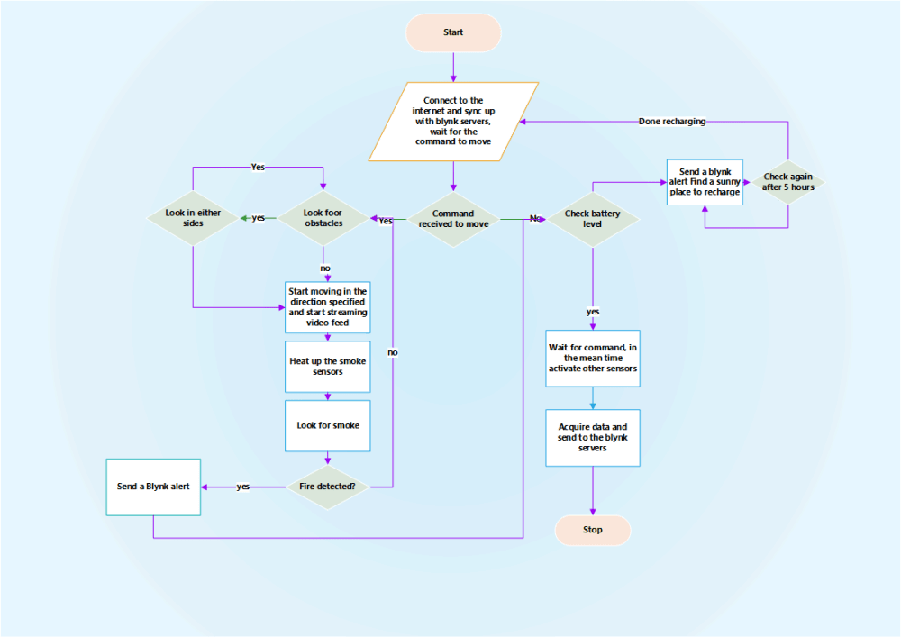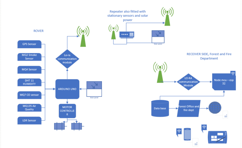Our idea is to deploy several bots to study and assess a given span of forest area. These bots communicate with a centralized control station and relay the data from the field to the control station. These bots are also fitted with small fire extinguishers to react in case of an emergency. Our rover consists of six wheels, each controlled by a motor driver (l298n) with a microcontroller (NODEMCU - ESP32). It is fitted with a wide range of sensors like ultrasonic sensors, Fire detectors, cameras (esp32), and GPS (NEO6M) to assess various parameters. A Li-ion battery with solar charging powers the system. All the data collected are sent back to the control station along with GPS coordinates through the internet of things network.