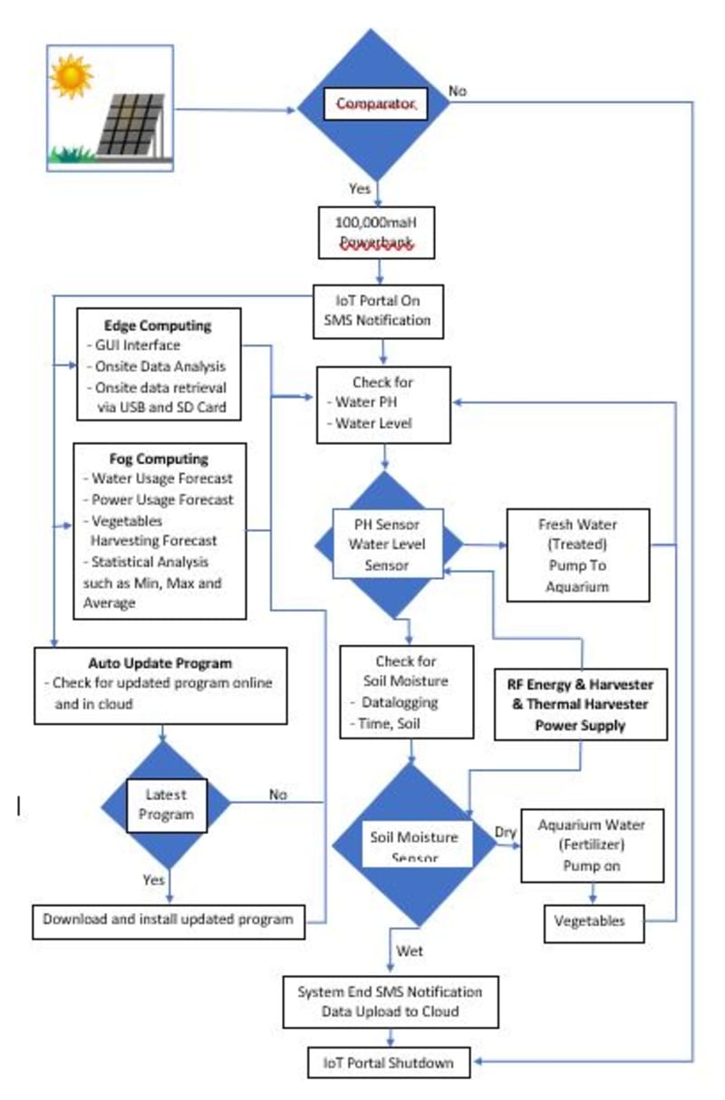 The IoT Portal can use graphical user interface making it user friendly and easily used by the public. The system uses sensors so that the amount of water is adequate and resources can be saved. It will use soil moisture sensor and PH sensor to monitor the water for the vegetables. When the soil is dry water will be supplied to the plants and fresh water will be added if the aquarium water PH is too acidic. The sensors will be powered by RF and thermal energy harvester. The Smart IoT Portal and the RF Energy transmitter will be powered by solar energy harvester. The system requires very minimal maintenance to suit the busy life of urban community.