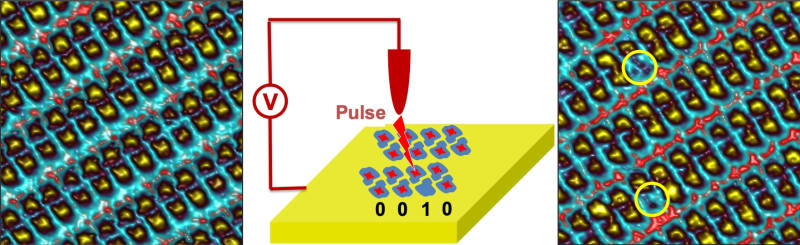 In laboratory experiments, our team used small electric pulses in a scanning tunneling microscope to switch individual molecules from bright to dark. We were also able to read and erase the information afterward at the press of a button. During the switching, the electric pulse changes the way the cation and the anion in the organic salt are stacked together and this stacking causes the molecule to appear either bright or dark. Apart from the switching itself, the spontaneous ordering of the molecules is crucial — through self-assembly, they find their way into a highly ordered structure (a two-dimensional crystal) without the need for expensive manufacturing tools, as is the case in currently used electronics. Also, the smart molecules themselves are prepared using standard synthetic chemistry protocols, which allows to make them in astronomic numbers and with atomic precision at low cost, something that is hard to imagine for any top-down nanoscale object.