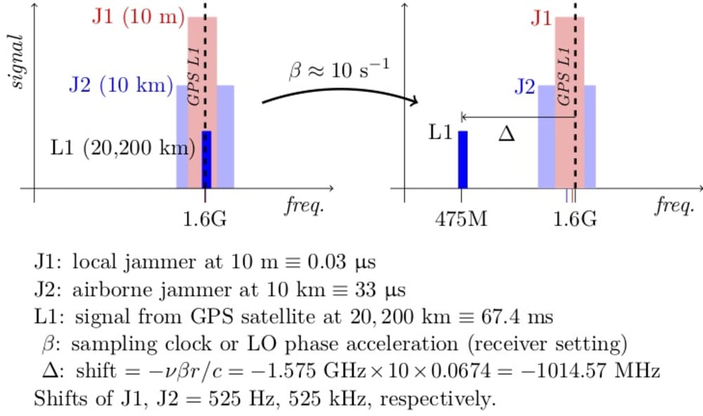 Now consider a receiver tuning to our modes with β ±10/s. The aliases of a jammer at 10 m appear at just 525 Hz shifts, at 1575,420,000±425 Hz, and those of an airborne jammer at 10 km (33,000 ft), at 525 kHz shifts, at 1575,489,486 and 1575,945,140 Hz. But the satellite L1 arrives at specific shifts of -βr/c = ±10/s x 67 ms = ±0.67, at 1575.42(1±0.67) = 475 MHz or 2.675 GHz. Our receiver's 400M and 2.6G antennas would be deaf to jamming and spoofing! (For comparison, the satellite and aircraft Dopplers would be under 5 kHz.)