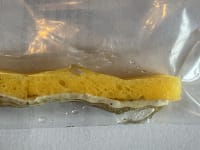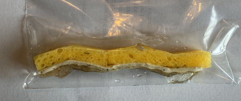 The illustrations include images of proof of concept devices that were created and tested. These example devices demonstrated that the sensors could be deployed through the use of biodegradable materials and could communicate after deployment. The first illustration is the device prior to deployment. They are approximately the size of an acorn. The second illustration shows a device that has been fully deployed when brought in contact with 15 mL of water. The device was still functional and could still communicate after deployment.