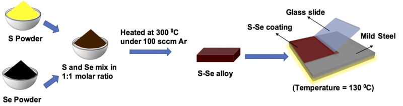 S-Se alloy has been synthesized using elemental sulfur and selenium in a 1:1 molar ratio and then heating to ~300 °C in an inert atmosphere. Initially, the thin coatings on mild steel were applied by using a doctor blade method. It can also be deposited on components with realistic geometries using scalable spray deposition. S-Se coated mild steel showed a corrosion rate that is 6-7 orders of magnitude lower than bare metal in abiotic (simulated seawater and sodium sulfate solution) as well as biotic (sulfate-reducing bacterial medium) environments. The high corrosion resistance of the alloy in diverse environments, stems from its semi-crystalline, non-porous, anti-microbial, dielectric, and viscoelastic nature. Mechanical testing of the alloy reveals markedly high modulus and hardness, far greater than most polymer and nanocomposite coatings, while also maintaining its flexible nature, unlike inorganic coatings. Further, the constituents possess inherent anti-microbial properties and do not dissolve in typical solvents, making it an ideal anti-corrosive coating for disparate environments. Finally, the alloy coating possesses a remarkable ability to repair damage and recover the coating performance. Such phenomena provide the added advantage of significantly reducing the probability of defects being generated and sustained, thus improving its longevity, and corrosion resistance under diverse circumstances.