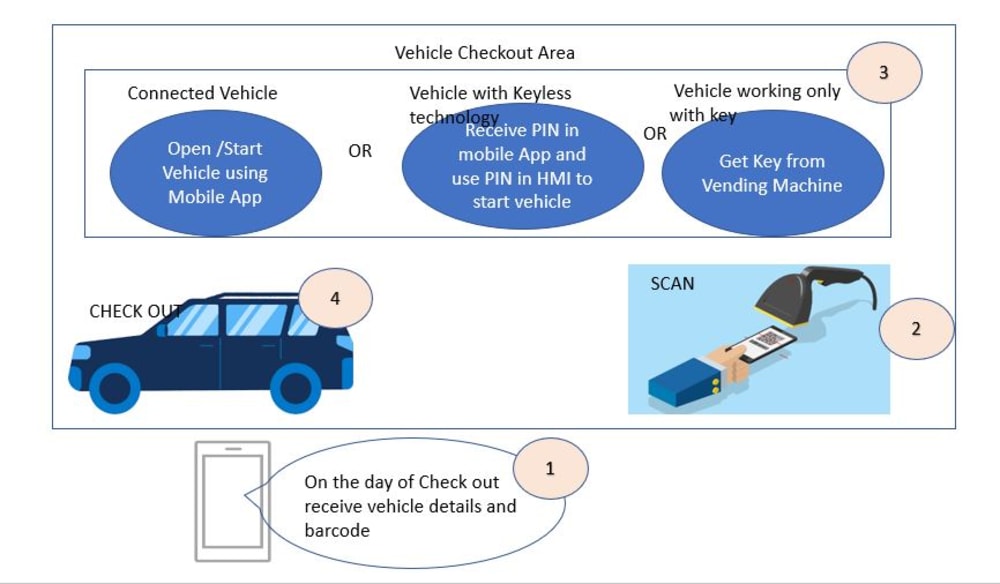 User can download the Car rental App , register himself and Choose Model , Pay advance. On the day of Check out the Company sends the Vehicle Identification Number, License Pate number and the QR CODE. The customer can directly walk to the vehicle area , scan QR code and take the vehicle out. - Configuring the Car for Customer’s Use made easier