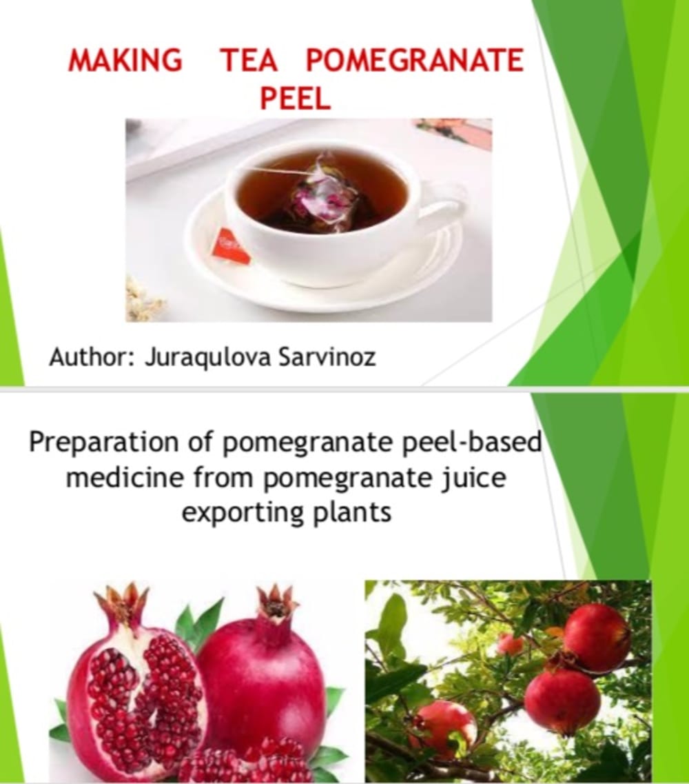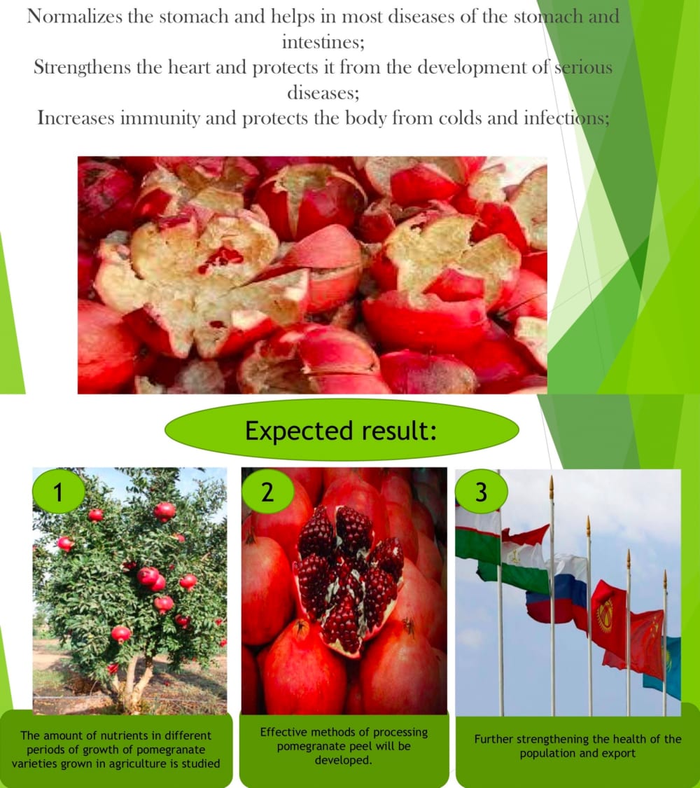 Effective methods of processing pomegranate peel will be developed. The amount of nutrients in different periods of growth of pomegranate varieties grown in agriculture is studied. Further strengthen the health of the population and export.