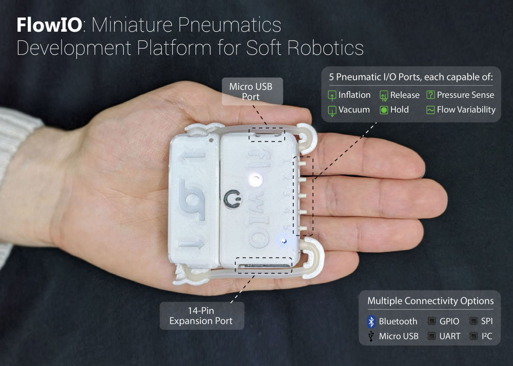 FlowIO is the world’s first fully integrated, miniature pneumatic development platform for actuation, sensing, and control of soft robotics and programmable materials. FlowIO was developed at MIT and deployed globally to democratize programmable matter; to make prototyping, innovation, and research with soft robotics incredibly quick and easy; and to enable researchers, designers, and makers of all backgrounds to unleash their creativity and bring their ideas to life. FlowIO is to soft robotics what Arduino is to electronics.