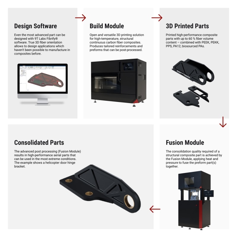 9T Labs’ Red Series system consists of its Fibrify software and two different machines, the Build module and the Fusion module. The Build module is essentially a 3D printer with two deposition feet to place thermoplastic filament alongside continuous fiber-reinforced filament. The platform is open source, and customers are free to use whatever filament they wish with some adjustment to print parameters to maintain the proper temperatures. The continuous fiber is also off-the-shelf, but with some modification. 9T Labs sources continuous fiber tape and has it cut into 1-mm widths and respooled; this flat tape is fed into the Build module before being delivered to the print head in the build chamber.