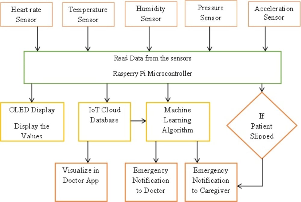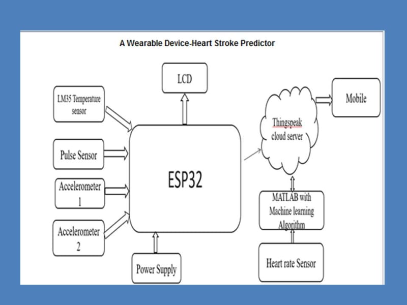 An opportunity to provide an Internet of Things solution has become easy with the increase of popularity of smart wearable devices. We proposed the wearable device which is used for adaptive fall detection for paralyzed patients/elders and heart stroke prediction. Real-time data of the patient such as blood pressure, body temperature, heart rate, and humidity can be monitored and analyzed by the machine learning algorithm. Thing Speak cloud server is used to store the real-time data received from the sensors associated with the patient and visualize it. The machine-learning algorithm is used to analyze the data and to predict the possibility of cardiac arrests with high accuracy. Our proposed wearable device saves the lives of patients and reduces the death rate by taking immediate care.