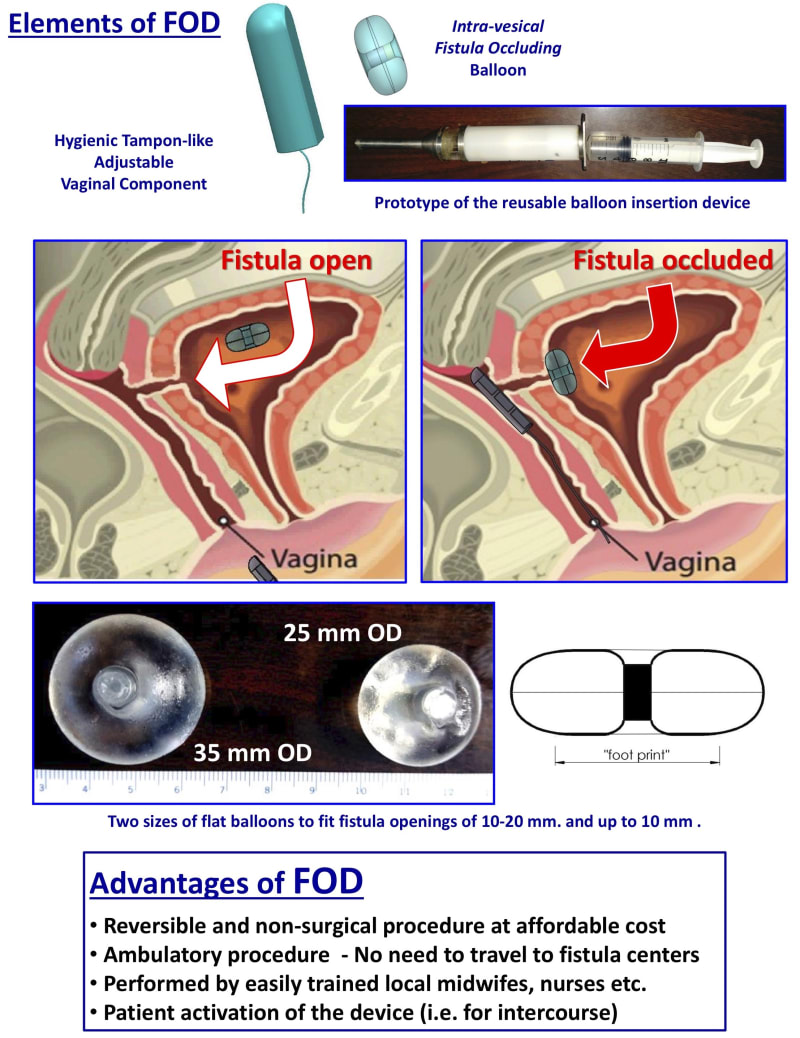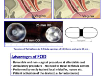 The FOD comprises a special intra-vesical occluding balloon containing a magnet and a removable silicone encased vaginal magnet, similar to a tampon. It is a simple treatment where the magnetic force of the vaginal insert attracts the balloon in the bladder to occlude the fistula, thereby creating instant dryness and allowing women to regain their lives.