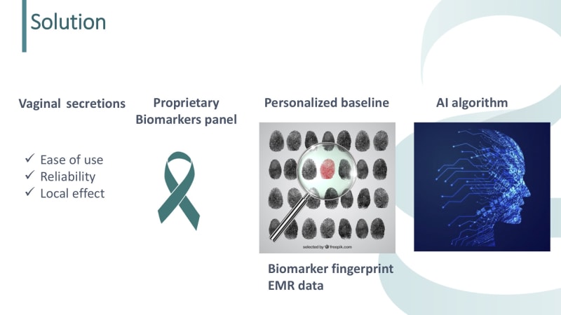 The concept of identifying precise biomarker profiles for each type of pathology using feminine discharges, along with the use of AI tools to analyze very small samples, enabled the creation of a revolutionary product to facilitate the early detection of many diseases, for which up to date no early detection exists (ovarian cancer, endometriosis and many more).
