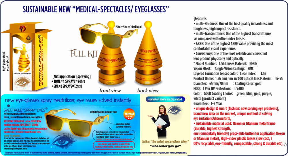 if you feel like your eyes are itching, discomfort, irritations, etc, put on your glasses [with tube container refilled with refined eye medicine liquid] & then you press the droplet button on the spectacle tube container on glass handle, then the spectacle-spray-eyes active liquid-gas diffuses slowly entering your eyes neutralizing/solving eyes issues that last longer for 6hrs then spray again if necessary to do so]