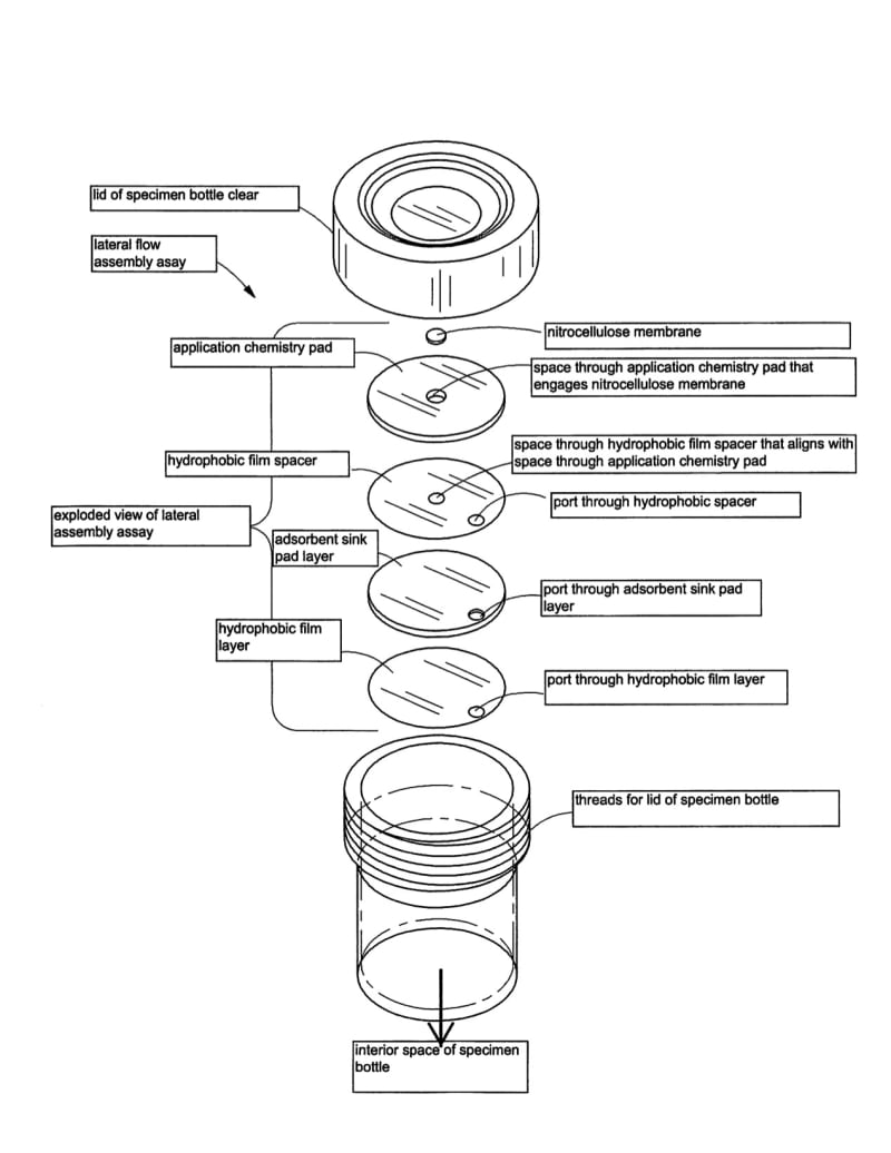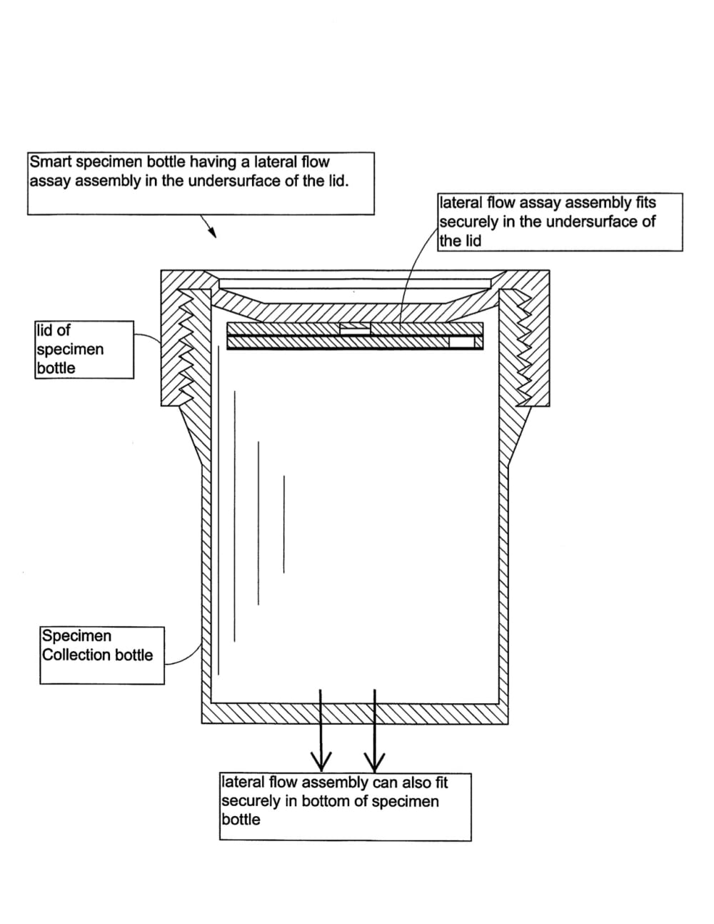 A lateral flow assay assembly secured within the specimen bottle undergoes a chromogenic reaction confirming the presence of protein in the bottle. The lateral flow assay assembly, secured in either the lid or floor of the bottle, amplifies the presence of trace amounts of protein and is a qualitative visual index indicating human protein presence. The lateral flow assay assembly comprises: a variety of known chromogenic substances that effect a color change in the presence of human protein; a protein binding disc such as a nitrocellulose membrane; an adsorbent sink pad; an application chemistry pad; a hydrophobic film; and a hydrophobic film spacer.