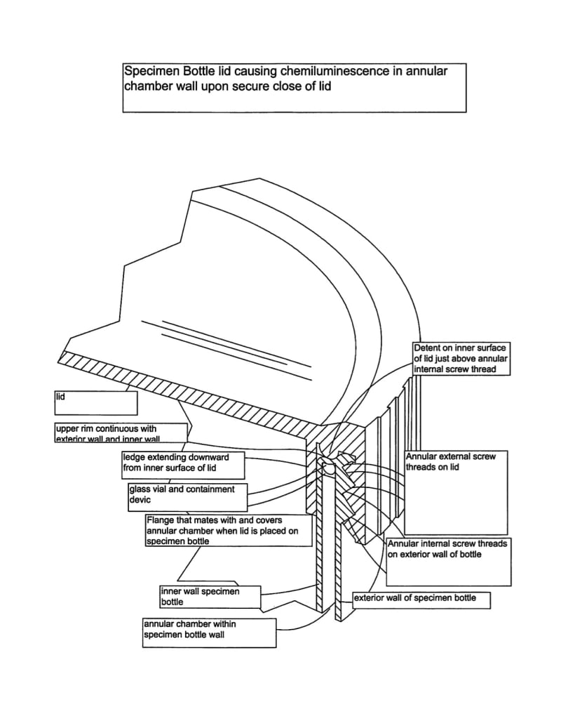 A separate chemiluminescent reaction occurs once the lid of the bottle is rotated to its complete closed position. An annular chamber concentric to the inner chamber of the collection bottle contains a dye such as fluorophore, a base catalyst, and diphenyl oxalate. A containment device is disposed in the annular chamber. The fragile containment device contains hydrogen peroxide and is positioned in the vicinity of the bottle screw threads and a detent. Upon complete closure of the lid of the collection bottle, the detent positioned above the superior lid screw thread compresses the exterior wall of the fragile containment device, causing rupture and allowing the hydrogen peroxide to mix with the dye, base catalyst, and diphenyl oxalate in the annular chamber. The subsequent chemical reaction causes the emission of light, visually confirming full closure of the lid on the collection bottle.