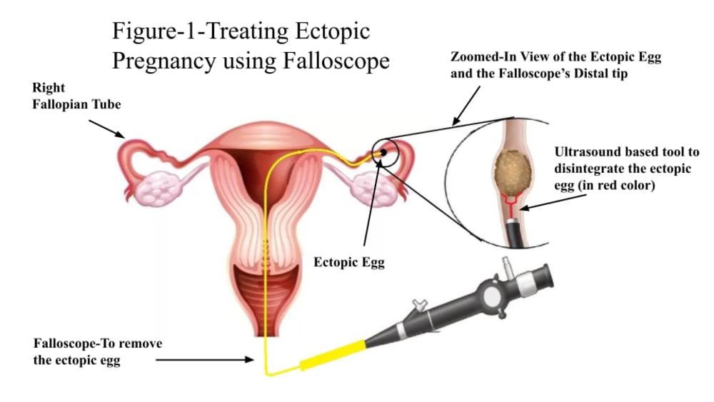 In this procedure, the doctor will push the Falloscope through the vagina into the uterus and into the fallopian tube (refer to the figure-1). The Falloscope distal tip will have a camera module along with an illumination channel which will help the doctor navigate. The distal tip will have one instrument channel and one suction channel (refer to the figure-2). The Instrument channel will be used to insert a tool similar to the one used in breaking a kidney stone to disintegrate an ectopically developed egg. The suction channel will suck those disintegrated egg's particles out of the woman's body.