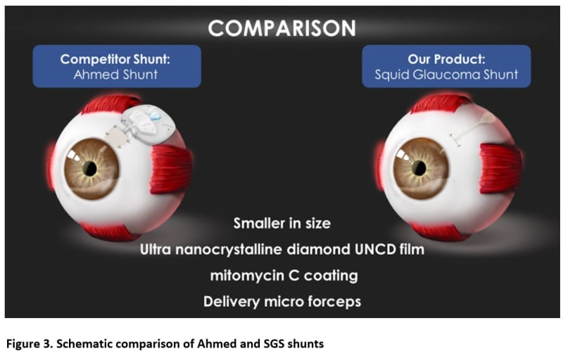 In the USA alone, direct costs related to glaucoma reached $ 5.8 billion annually according to a 2013 report. The global glaucoma surgery market was valued at $818 million in 2020, projected to reach $6.5 billion by 2030 with a compound annual growth rate of 24.6%. At present, due to the complexity of the procedures, complications, and invasiveness of the bulky GDDs, only 40% of glaucoma patients undergo surgical interventions. The less invasive SGS implant would make early surgical intervention an option to wider sections of the glaucoma population with presumably better outcomes, thus preventing blindness.