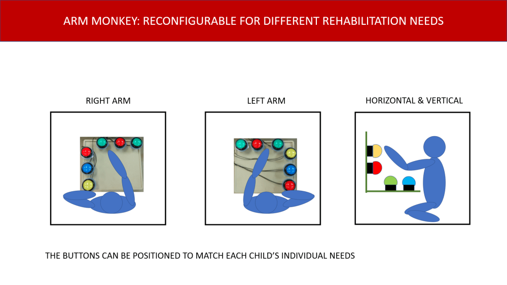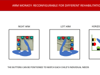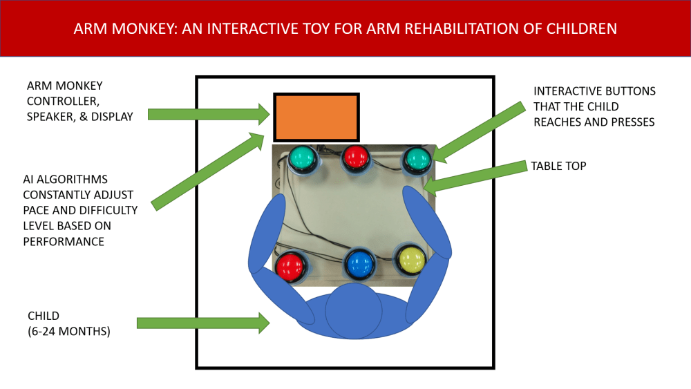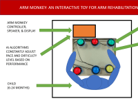 Arm Monkey is part toy, part exercise machine, that makes rehabilitation fun for infants and toddlers (6-24 months). It is aimed towards providing arm rehabilitation for young children with neuromuscular conditions that can be improved with arm exercises. Arm Monkey consists of a system of colorful buttons placed in front of the child. The buttons are movable and can be positioned to best suit a child’s body size and rehabilitation needs. Then with a series of activities full of sounds, music, and lights, the Arm Monkey takes the child on an adventure, encouraging her/him to push different buttons. A button that needs to be pressed will light up along with sound and musical cues. Once the child moves his/her arm and presses the button, he/she receives rewarding audio/visual cues from Arm Monkey. In this adventure, the pace of the game picks up as the child progresses through the game. Artificial Intelligence algorithms in Arm Monkey continuously monitor the progress of the child and adapt the pace and difficulty level to the child’s level of performance…constantly challenging, but not frustrating the child…nudging him/her to continuously improve.