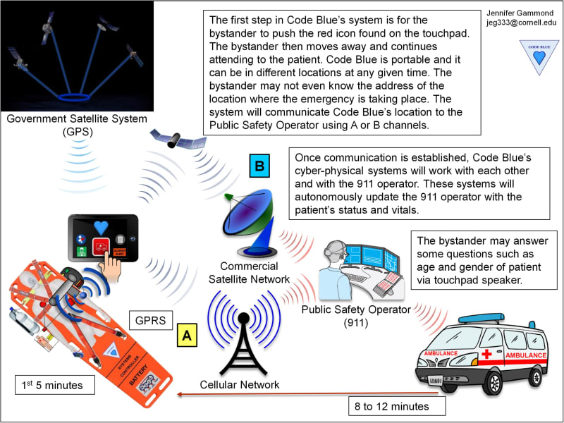 Once a bystander opens Code Blue and releases the wireless tablet – cyber-physical systems will be initialized. Using the built-in module, the system will automatically call 911, provide the precise location of where the emergency is taking place and the status and vitals of the patient. The more specific information that EMS and the hospital can get prior to attending the victim, the better prepared they will be to deal with the emergency. A voice channel is also established automatically.