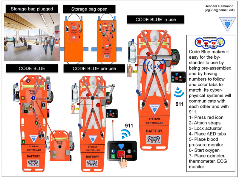 Code Blue is portable, and stored folded and pre-assembled in a clearly marked location (similar to existing AEDs and fire extinguishers). It would self-diagnose and it would be continuously plugged into an electric outlet.