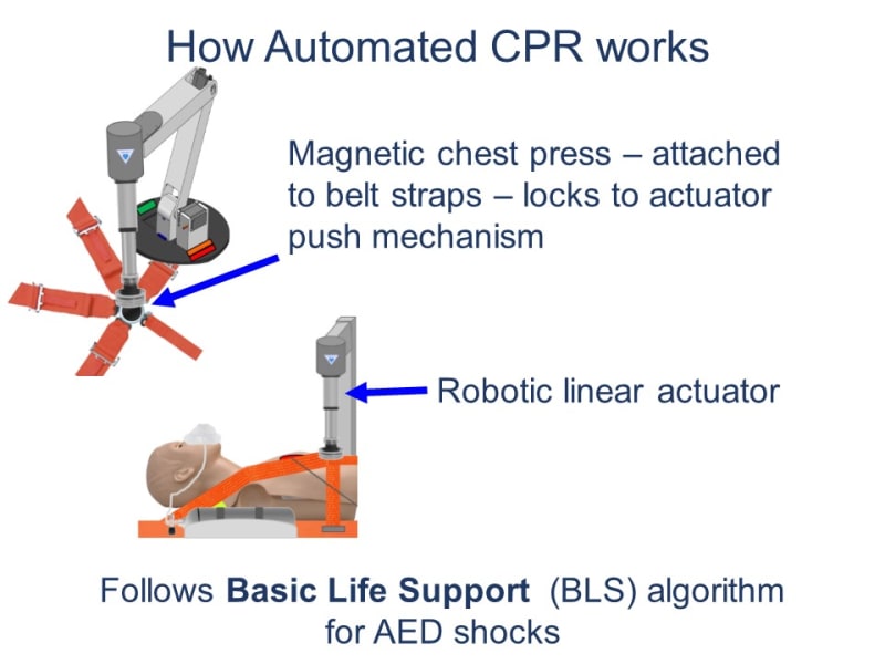 Code Blue’s robotic CPR arm, would be anchored in the medical backboard. The magnetic chest press, which is a component of the automated CPR, is attached to the backboard’s belt straps and is to be positioned on person according to the position guide diagram on backboard. The actuator locks to the magnetic chest press and would be programmed to apply 125 lbs. of compression with 2” of pressure at a rate of 120 compressions per minute. It would be programmed to stop CPR application and start the AED according to the Basic Life Support algorithm.