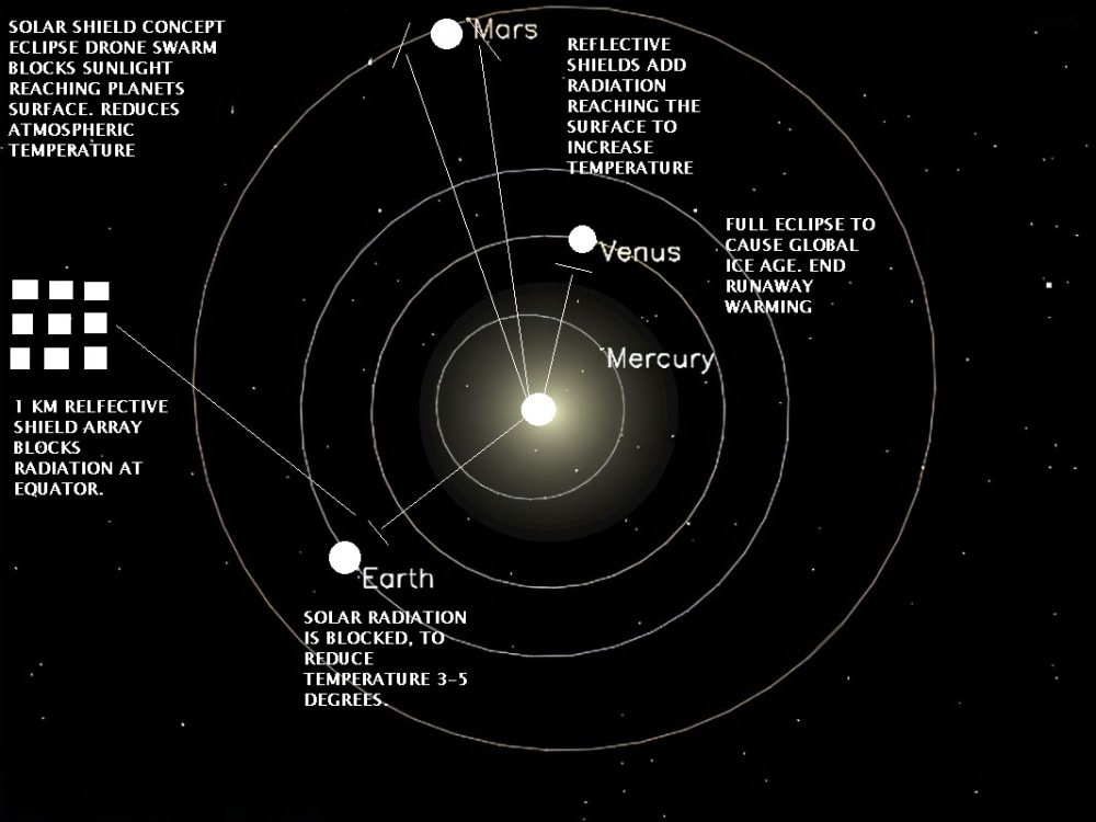 A swarm of drone devices are places in orbit between the plane and sun. 1 km reflective shield array of sufficient size and numbers to make the desired impact on the amount of warming radiation reaching the planet’s surface. The swarm is computer controlled, solar powered and in synchronous orbit with the planet located between the sun and the planet's equator.