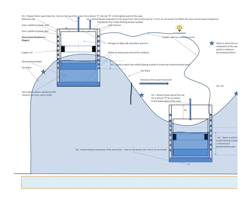 The Wave’s inertial electric generator (WIEG) is a small linear electric generator in which a part is moving almost continuously based on a special sealed construction of some cylinder (with a Donut Fixed Neodymium Magnet) in cylinder (with double walls inside the copper coils to collect the generated current) using the inertial effect when floating on the sea wave in an up & down movement.