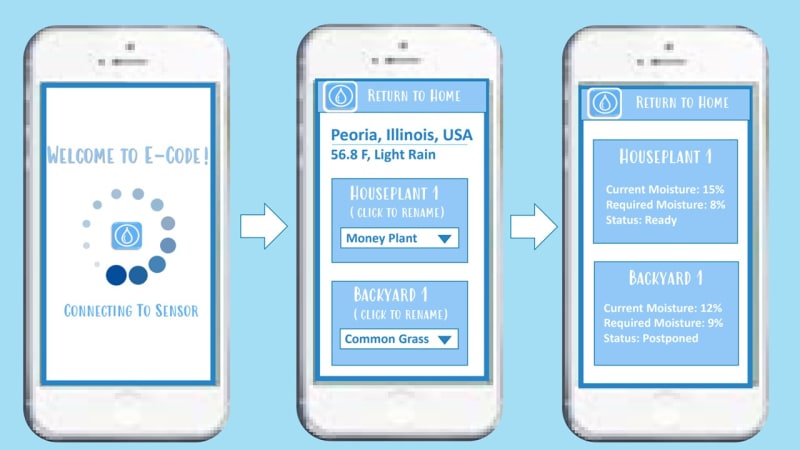 E-Code is an original smart irrigation system that uses an amalgamation of technology in order to save water. In short, E-Code works to optimize water usage while minimizing consumer costs! All the user needs to do through the app is insert the provided underground humidity sensor into their plant of choice and input a few simple details (such as their location and plant type). From there, the app will take over and use information including the weather forecast APIs and information from a global plant database to determine whether the plants/land should be irrigated.