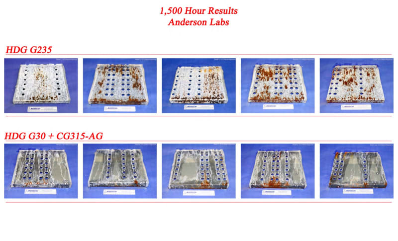 InterCoat ChemGuard AG is a waterborne dried-in-place coating that bonds at a molecular level (covalently) with the galvanized zinc coating and enhances its corrosion resistance by impressive multiple (refer to illustrations for accelerated testing). When InterCoat ChemGuard is applied and reacted with thin layers of galvanized coating, it significantly slows the rate of corrosion/sacrifice so that it lasts longer and protects better.